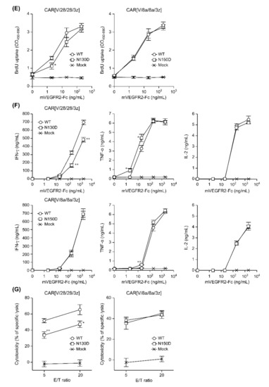 Antigen-specific proliferative activity was compared using various CAR-T cells on the fourth day of culture. As a result, CAR[V/28/28/3z](N130D)-T cells showed a slight decrease compared to CAR[V/28/28/3z]-T cells (Figure 4E). This was considered to be due to the difference in the CAR expression level shown in Figure 4D. On the other hand, CAR[V/8a/8a/3z] and CAR[V/8a/8a/3z](N150D) showed similar antigen-concentration-dependent growth profiles. The antigen-stimulation-associated cytokine production of CAR[V/28/28/3z](N130D)-T cells was lower than that of CAR[V/28/28/3z]-T cells only for IFN-γ (Figure 4F). The IL-2 production ability of CAR[V/28/28/3z](N130D)-T cells as well as the IFN-γ and IL-2 production ability of CAR[V/8a/8a/3z](N150D)-T cells were equivalent to those of CAR-T cells expressing the corresponding unsubstituted CAR variants. Further, both CAR[V/28/28/3z](N130D)-T cells and CAR[V/8a/8a/3z](N150D)-T cells exhibited slightly greater TNF-α production than wild-type CAR-T cells. Similarly to the patterns observed for proliferative activity, CAR[V/28/28/3z](N130D)-T cells demonstrated slightly lower cytotoxic activity compared to CAR[V/28/28/3z]-T cells (Figure 4G). In contrast, CAR[V/8a/8a/3z](N150D)-T cells exhibited the same cytotoxic activity as the original CAR[V/8a/8a/3z]-T cells.