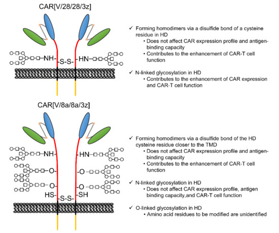 In summary, N-linked glycosylation at asparagine residues in the CD28-derived HD promoted CAR expression and CAR-T cell function. In contrast, N-linked glycosylation of the CD8α-derived HD did not greatly affect CAR expression nor CAR-T cell function.