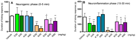 Effects of compounds 3, 4, 6, and 9 administered i.p. on the duration of the licking/biting behavior in the first (neurogenic) phase (0–5 min after formalin injection) (A), and in the second (inflammatory) phase (15–30 min after formalin injection) (B) of the formalin test in mice. Data are presented as mean ± SD. Statistical analysis: one-way analysis of variance (ANOVA), followed by Dunnett’s post hoc test: * p < 0.05, ** p < 0.01, *** p < 0.001, vs. vehicle treated mice, n = 8.