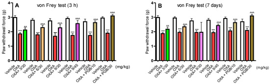 Effects of selected compound 3, 6, 9 and pregabalin (PGB) administered i.p. on tactile allodynia evaluated 3 h (panel A) and 7 days (panel B) after oxaliplatin injection, measured using the von Frey test in mice. Data are presented as mean ± SD. Statistical analysis: repeated measures, ANOVA, followed by Bonferroni’s multiple comparison test. Allodynic effect of oxaliplatin vs. vehicle-treated mice: *** p < 0.001. Antiallodynic effect of the compounds tested vs. oxaliplatin—treated mice: ^^ p < 0.01, ^^^ p < 0.001, n = 10. OXA: oxaliplatin.