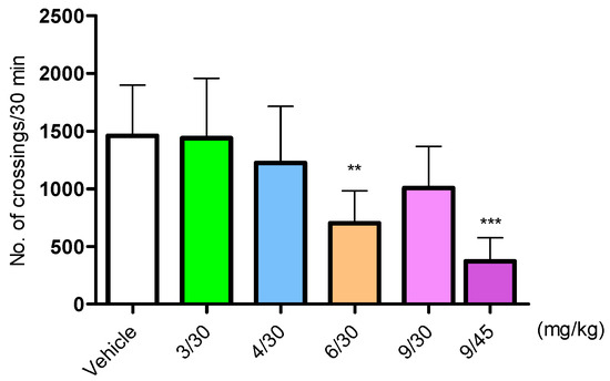 Effects of compounds 3, 4, 6, and 9 administered i.p. on locomotor activity of mice. Data are presented as mean ± SD of beam breaks recorded for 30 min. Statistical analysis: one-way analysis of variance (ANOVA), followed by Dunnett’s test. Significant difference compared with the vehicle-treated group: ** p < 0.01, *** p < 0.001, n = 8.