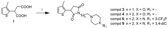 Synthesis of anticonvulsants 3, 4, 6, and 9 identified previously [18]. i: appropriate primary amine, 180 °C, 1.5 h. Note: numbering of compounds according to Góra et al., 2020 [18].