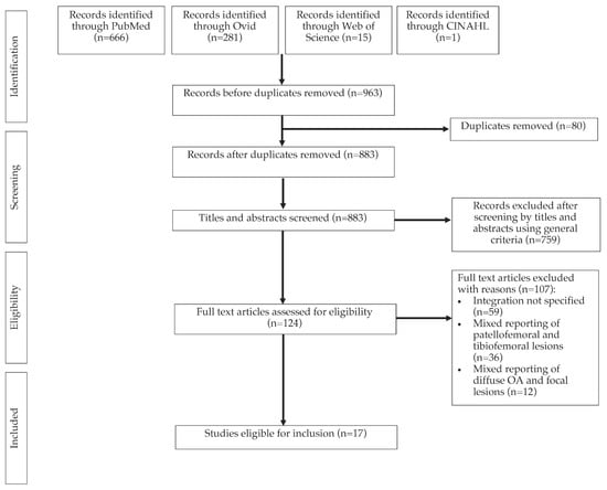 A total of 963 papers were identified after the initial search on five databases (Figure 1). Following deduplication, 883 papers remained for title and abstract screening. A total of 124 full texts were assessed for eligibility, from which 17 studies were eligible for data synthesis.