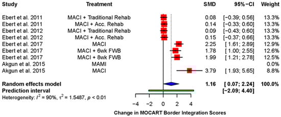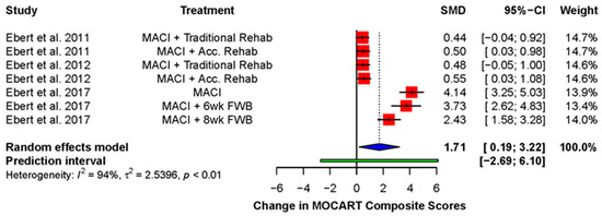Ebert and colleagues frequently measured the overall quality of the repair using an MRI or MOCART composite score [38,39,49,54]. This was derived by multiplying the score for each domain by a weighting factor and adding the scores together [49]. A significant improvement was found (standardized mean difference: 1.71; 95% CI (1.88, 3.22); p = 0.03), demonstrating a global improvement across the various domains of the MOCART score over the duration of follow-up (Figure 4).