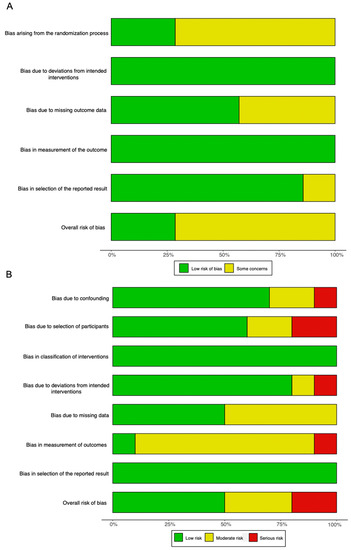 Summary graphs showing the overall risk of bias analysis using (A) the RoB 2.0 tool in randomized studies and (B) the ROBINS-I tool in non-randomized studies.
