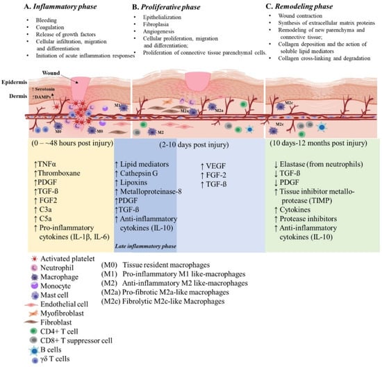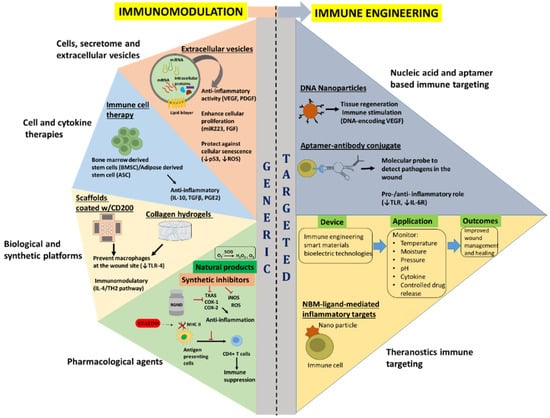 Successful wound healing requires the coordinated activities of multiple cell types that constitute the inflammatory and regenerative response following tissue injury. While mesenchymal stem cells (MSCs), endothelial cells, keratinocytes and fibroblasts have a central role in the regenerative phase, immune cells such as neutrophils, monocytes, macrophages, mast cells, T and B lymphocytes, myeloid-derived suppressor cells (MDSCs) and dendritic cells (DCs) respond to inflammatory triggers transmitted from the wound site, become activated and undergo cell proliferation, differentiation and migration [,]. Identifying cytokines, essential growth factors, matrix components and diverse cellular populations present at the wound site during normal and impaired healing promotes the development of promising therapeutic intervention for clinical applications. Principally, the wound healing process starts immediately after an injury, with a surge of inflammatory cells, clotting factors and cytokines, responding to external stimuli. There are many approaches to improving the healing process; however, tuning the inflammatory phase to an appropriate response, which is not found in aberrant healing scenarios, will almost certainly set the stage for optimal regeneration of the injured tissue []. This review outlines the immunological processes occurring during healing of cutaneous wounds following traumatic extremity injury and aims to discuss the current immunomodulatory approaches to regulate inflammation following an acute injury. Further, it enunciates the advancements in the emerging immune-targeting and immune engineering approaches applied in several wound healing and regeneration studies.