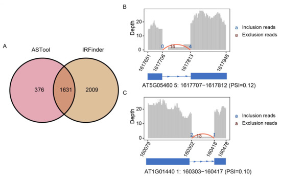 We further used the real RNA-Seq data of Arabidopsis under heat stress (GSM2467113) to analyze and visualize novel IR events identified by ASTool. For comparison, novel IR events were also identified using IRFinder. Note that we selected introns labeled as “clean” by ASTool, and introns without warning for IRFinder. ASTool and IRFinder separately detected 2007 and 3640 IR events. Of them, a total of 1631 events overlapped (Figure 3A). Moreover, the visualization of the identified novel IR events was exemplified by two cases. In the first case, we focused on a potential IR event in AT5G05460, which ASTool failed to detect but was successfully identified by IRFinder. The AT5G05460 gene encodes Arabidopsis endo-β-n-acetylglucosaminidase (ENGase), with a full sequence length of 680 amino acids [28]. If the IR event occurs as detected by IRFinder, the gene will introduce a premature termination codon (PTC) at the 393th amino acid position, resulting in the loss of the following 287 amino acids. As shown in Figure 3B, the number of reads mapped to the junction connecting the left exon to the intron (i.e., E1_I junction) is zero, which is highly imbalanced with the junction connecting the intron to the right exon (i.e., I_E2 junction). Therefore, it is not assigned as a novel IR event in ASTool, although the calculated PSI value is 0.12. In the second case, we selected a potential retained intron in AT1G01440 that was successfully detected by ASTool but failed by IRFinder (Figure 3C). AT1G01440 encodes a GTP binding-related protein with a sequence length of 664 amino acids, playing an important role in stress resistance [29]. From the results of ASTool, although the number of reads mapping to the junction is relatively small, it can be assigned as an IR event since the inferred PSI value is equal to 0.10. Interestingly, the IR event will introduce PTC at the 572th position and result in 92 residues being missed at the C-terminal. In summary, ASTool can be used to detect and visualize novel retained introns intuitively, providing new hints to guide further experimental studies in deciphering gene functions.