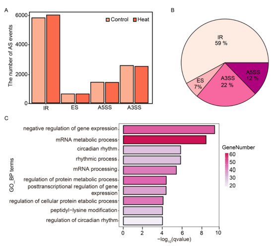 A case study of using ASTool in AS identification and analysis on real RNA-Seq data of Arabidopsis under heat stress. (A) The average number of the four identified AS types in the control and heat stress groups. (B) Distribution of the four differentially spliced AS events. (C) GO enrichment analysis of the identified (DSGs) on the biological process category.