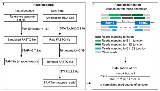 The preprocessing of RNA-Seq data and IR event identification with ASTool. (A) Data preparation. For simulated data, reads are simulated from Arabidopsis genome data. For real data, reads are directly from Arabidopsis RNA-Seq data downloaded from NCBI. As shown in panel A, the simulated/real data are then directly mapped to the reference genome with STAR. (B) IR detection and PSI calculation. SAM files are used to assign reads into 4 types of junctions (i.e., E1_I, I, I_E2, and E1_E2) (upper panel). Finally, the normalized read counts of 3 types of junctions (i.e., E1_I, I_E2, and E1_E2) are used to calculate PSI (lower panel).