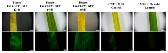 Brightfield and fluorescence stereomicroscope images of rice leaves three days post-infiltration with binary CmYLCV::GFP pDNA-CNT solutions at 2:1, 4:1, or 6:1 pDNA:CNT ratios. Exposure time was 800 ms.