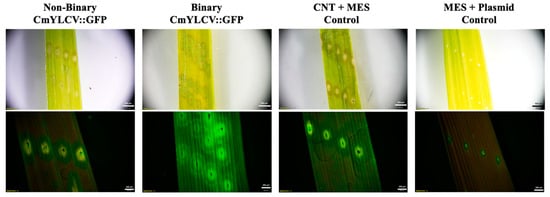 Brightfield and fluorescence stereomicroscope images of rice leaves three days post-infiltration using binary and nonbinary vectors encoding GFP with CmYLCV promoters. The CNT solution consists of a 2:1 pDNA:CNT ratio. Exposure time was 800 ms.