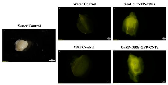 Further, excised embryos were imbibed in pDNA-CNT solutions for two days prior to viewing fluorescence under the microscope. Although some background fluorescence was present in the control samples, an increase in fluorescence can be seen in the samples imbibed with CNTs attached with CaMV::GFP and ZmUBI::YFP plasmids at a 1:3 ratio of plasmid DNA to CNTs (Figure 3).