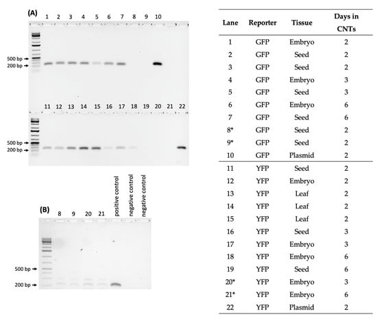 Moreover, reverse transcription PCR (RT-PCR) with GFP-specific primers on a subset of fluorescing samples showed three out of three excised embryo samples showing a positive product, while four out of six whole seeds tested positive for GFP transcripts. Similarly, three out of five excised embryos and three out of three imbibed seeds tested positive for YFP-specific primers (Figure 4). Although further optimization is needed, these results showed promise for the ability of CNTs to deliver plasmids into excised embryos.