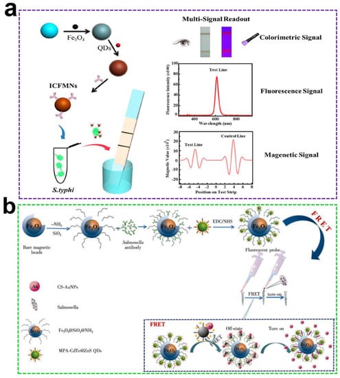 - Guo, Z.; Huang, X.; Li, Z.; Shi, J.; Zhai, X.; Hu, X.; Liang, N.; Zou, X. Rapid and highly sensitive detection of Salmonella typhimurium in lettuce by using magnetic fluorescent nanoparticles. Anal. Methods 2020, 12, 5861–5868. [Google Scholar] [CrossRef]