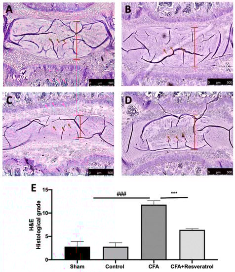 Resveratrol administration reduced intravertebral disk degeneration. Hematoxylin and Eosin staining: Sham (A), Control (B), CFA (C), CFA + Resveratrol (D), Histological score (evaluation of anulus fibrosus and nucleus pulposus) (E). ### p < 0.001 vs. sham, *** p < 0.001 vs. CFA. Error bar shown as SEM.