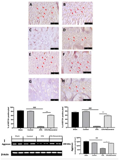 Resveratrol administration restored notochordal cells and cartilage markers. Immunohistochemical analysis of KRT18: Sham (A), Control (B), CFA (C), CFA + Resveratrol (D); Immunohistochemical analysis of KRT19: Sham (E), Control (F), CFA (G), CFA + Resveratrol (H); Western Blot analysis of Aggrecan (I). * p < 0.05 vs. CFA, ### p < 0.001 vs. sham, *** p < 0.001 vs. CFA. Error bar shown as SEM.