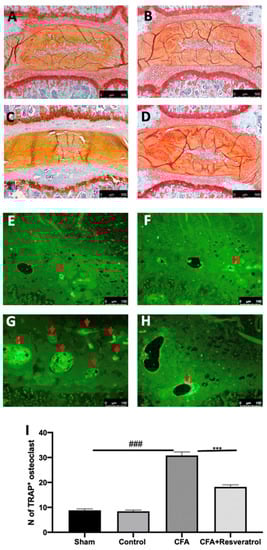 Resveratrol administration reduced osteoclast activation. Safranin-O and fast green staining: Sham (A), Control (B), CFA (C), CFA + Resveratrol (D); Immunofluorescence analysis of TRAP: Sham (E), Control (F), CFA (G), CFA + Resveratrol (H), N of TRAP+ osteoclast (pointed by the arrows) (I). ### p < 0.001 vs. sham, *** p < 0.001 vs. CFA. Error bar shown as SEM.