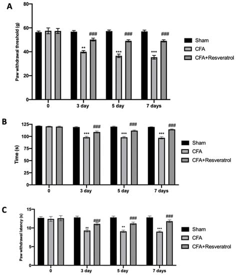 Resveratrol administration reduced mechanical allodynia, motor dysfunction and thermal hyperalgesia: Von Frey Test (A), Rotarod Test (B) and Plantar Test (C). ** p < 0.01 vs. CFA, ### p < 0.001 vs. sham, *** p < 0.001 vs. CFA. Error bar shown as SEM.