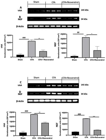 Resveratrol administration reduced pain-related signaling. Western blot analysis of: trkA (A), NGF (B) expression in the disc tissue; Western blot analysis of: trkA (C), NGF (D) expression in the spinal cord tissue. * p < 0.05 vs. CFA, ## p < 0.01 vs. sham, ** p < 0.01 vs. CFA, ### p < 0.001 vs. sham, *** p < 0.001 vs. CFA. Error bar shown as SEM.