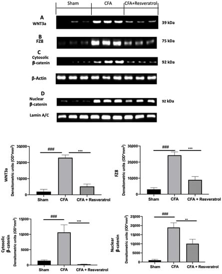 Increased WNT3a (Figure 6A) and FZ8 (Figure 6B) expression was detected in samples collected from CFA-injected rats as compared with sham samples. Additionally, CFA-injected animals showed increased β-catenin accumulation in both cytosolic (Figure 6C) and nuclear (Figure 6D) compartments. Samples harvested from resveratrol-treated rats showed reduced WNT3a (Figure 6A) and FZ8 (Figure 6B) expression, as well as reduced β-catenin accumulation in both cellular compartments (Figure 6C,D). The results were examined by one-way ANOVA followed by Dunnett post-hoc test for multiple comparisons (WNT3a (F(2,6) p < 0.0001); FZ8 (F(2,6) p < 0.0001); cytosolic β-catenin (F(2,6) p = 0.0002); nuclear β-catenin (F(2,6) p = 0.0001)).