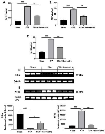 In order to evaluate the activation of inflammatory pathways, cytokines expression was assessed. Upregulated levels of IL-18 (Figure 7A), TNF-α (Figure 7B) and IL-1β (Figure 7C) were found in samples from the CFA-treated group as compared to those from sham-treated animals. Resveratrol treatment significantly reduced their levels (Figure 7A–C). Resveratrol administration importantly increased cytosolic IkB-α expression, which was reduced by CFA injection, restoring it to the sham levels (Figure 7D). Western blot analysis also showed reduced nuclear NFkB expression in samples harvested from resveratrol-administered rats (Figure 7E), as compared to those form CFA-injected animals. The results were examined by one-way ANOVA followed by Dunnett post-hoc test for multiple comparisons (IL-18 (F(2,12) p < 0.0001); TNF-α (F(2,12) p < 0.0001); IL-1β (F(2,12) p < 0.0001); IkB-α (F(2,6) p = 0.0002); NFkB) (F(2,6) p < 0.0001)).