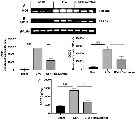 Increased expression of iNOS and COX-2 was detected in samples harvested from CFA-injected animals, as compared to samples from sham rats. Resveratrol treatment reduced the levels of both molecules (Figure 8A,B). Resveratrol reduced PGE2 levels as well, as compared to the levels measured in CFA-injected rats (Figure 8C). The results were examined by one-way ANOVA followed by Dunnett post-hoc test for multiple comparisons (iNOS (F(2,6) p < 0.0001); COX-2 (F(2,6) p = 0.0009); PGE2 (F(2,12) p < 0.0001)).