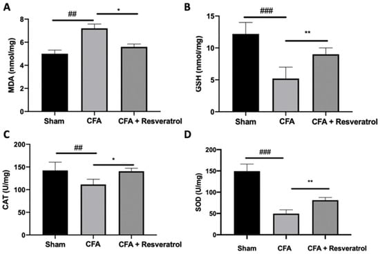 Biochemical parameters were investigated to assess the presence of oxidative stress. Upregulated lipid peroxidation was detected in CFA-injected rats, while resveratrol administration reduced MDA levels (Figure 9A). GSH levels, SOD and CAT activity decreased in the CFA group, as compared to the sham animals. Resveratrol increased GSH level (Figure 9B) and SOD (Figure 9C) and CAT (Figure 9D) activities. The results were examined by one-way ANOVA followed by Dunnett post-hoc test for multiple comparisons (MDA (F(2,12) p = 0.001); GSH (F(2,12) p < 0.0001); CAT (F(2,12) p = 0.0043); SOD (F(2,12) p < 0.0001)).