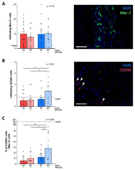 - Laplante, P.; Brillant-Marquis, F.; Brissette, M.-J.; Joannette-Pilon, B.; Cayrol, R.; Kokta, V.; Cailhier, J.-F. MFG-E8 Reprogramming of Macrophages Promotes Wound Healing by Increased BFGF Production and Fibroblast Functions. J. Investig. Dermatol. 2017, 137, 2005–2013. [Google Scholar] [CrossRef] [PubMed] [Green Version]