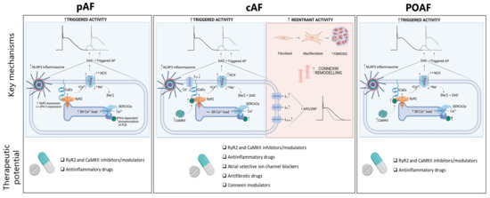Key pathways for formation of AF. Triggered activity is common in all 3 forms of AF, which includes Ca2+ handling abnormalities, RyR2-channel dysfunction and triggered activity in form of DADs. Re-entry activity is commonly observed in patients with cAF, but less frequent and consistent in patients with POAF and pAF. The NLRP3 inflammasome is upregulated in all forms of AF, but plays the biggest role as an acute trigger in patients that present with POAF. AP, action potential; APD, action potential duration; cAF, chronic atrial fibrillation; CaMKII, Ca2+-calmodulin protein kinase II; DAD, delayed afterdepolarization EAD, early afterdepolarization; JPH-2, junctophilin-2; PKA, protein kinase A; ERP, effective refractory period; NCX, Na+/Ca2+-exchanger; NLRP3 inflammasome, NACHT, LRR and PYD domains-containing protein 3; pAF, paroxysmal AF; PLB, phospholamban; POAF, post-operative AF; RyR2, ryanodine receptor type-2; SCaE, spontaneous Ca2+-release events; SERCA, sarcoplasmic reticulum Ca2+-ATPase type-2a; SR, sarcoplasmic reticulum.