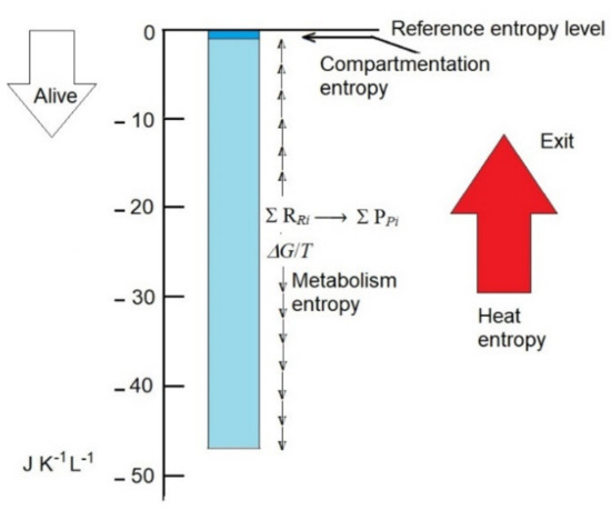 Compartmentation entropy and metabolism entropy are plausibly the main contributors that, by decreasing the entropy of non-living biomass (reference entropy level), convert it to live biomass. Entropy values in the scale may be representative of the human body. Compartmentation entropy is essentially constant, and metabolism entropy (due to the departure from reaction equilibrium) is variable. Exportation of heat entropy (red arrow) prevents the collapse of compartmentation and metabolism entropies to 0.