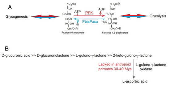 (A) Phospho-fructose-kinase (PFK) and fructose 1,6-bisphosphatase (FbisPase) would provide a futile metabolic cycle in glycolysis and glycogenesis consuming ATP and producing entropy. Strict metabolic controls ensure that they do not function simultaneously. (B) Biosynthetic pathway for the synthesis of L-ascorbic acid. Anthropoid primates lack the enzyme L-gulono-γ-lactone oxidase.