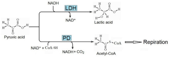 Conversion of pyruvic acid to lactic acid and acetyl-CoA catalyzed by lactate dehydrogenase (LDH) and pyruvic dehydrogenase (PD), respectively. Enhanced activity of LDH is critical for the Warburg effect and the production of lactic acid in cancer.