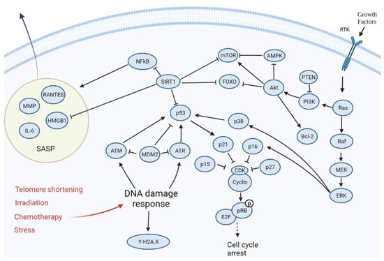 In particular, a low level of stress and, consequently, a low p16 level, leads to a temporary arrest of the cell cycle, while a higher level of stress leads to senescence. Low and temporary increases in p53 expression and acetylation of p53 at Lys 161/Lys162 contribute to cell cycle arrest and senescence, while higher levels of p53, acetylation at Lys117, and interaction of DNA-binding domains within p53 lead to the transcription of proapoptotic genes and induction of apoptosis [].