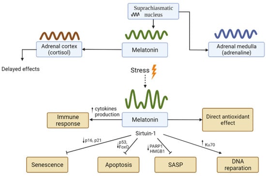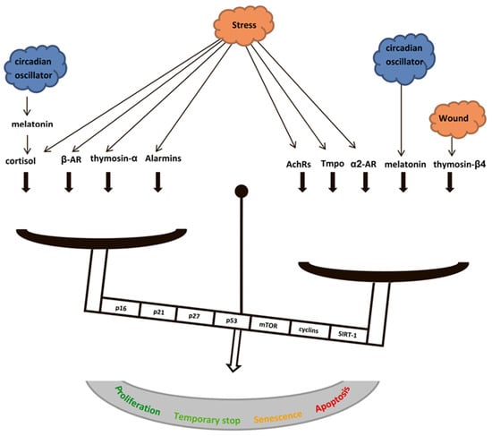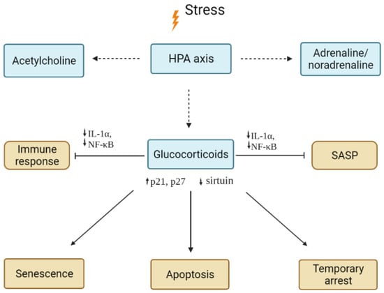 Although there have been several studies on the hypothalamic–pituitary–adrenal (HPA) axis and whole organism ageing [], we found no study that systematically analysed the relationship between the neuroendocrine regulators of stress and inflammation and intracellular mechanisms controlling cell cycle, senescence, and apoptosis. This review was aimed at filling this gap. We investigated the available data concerning the effects of the HPA axis and the mediators of the parasympathetic and sympathetic systems mediating responses to stressful influences, several thymus hormones that specifically affect the immune cells and are often considered as belonging to the stress-response system, and the hormone melatonin, a primary endocrine regulator of circadian rhythms, on signalling cascades associated with the control of cell cycle, senescence, and apoptosis.