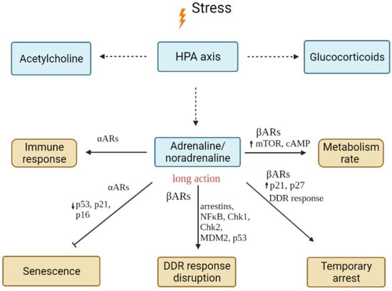 Schematic representation of effects of adrenaline and noradrenaline, sympathetic system neurotransmitters on intracellular processes and signalling pathways related to senescence, apoptosis, and cell cycle regulation. ↑—stimulation, ↓—inhibition, αARs—α-adrenoreceptors, βARs—β-adrenoreceptors.