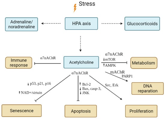 Schematic representation of effects of acetylcholine, the parasympathetic system neurotransmitter, on intracellular processes and signalling pathways related to senescence, apoptosis, and cell cycle regulation. ↑—stimulation, ↓—inhibition, α7nAchRs—α7-nicotinic acetylcholine receptors, mAChR—muscarinic acetylcholine receptors.