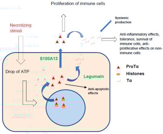 In our previous review [], we described results indicating that when cells were exposed to necrotising, but not apoptotic stimuli, there were changes in the localisation and secretion of ProTα, which then cleaved to form Tα. This secretion occurs very quickly, since it does not require additional synthesis and ProTα is already present in the cell in large amounts, comparable to the amounts of histones. Matsunada and Ueda [] demonstrated that ProTα secretion occurs in a non-vesicular manner, with the participation of the S100A13 carrier molecule from the S100 protein family. The authors noted that this method of secretion is characteristic of necrotic stress, not non-apoptotic stress. In addition, it was noted that a necrotic stimulus (a drop in the ATP level) in the cell led to the release of almost all ProTα from the nucleus, indicating that the presence of this peptide in the extracellular environment may be one of the first signs of necrosis. This secretion can serve as a signal for the immune system.