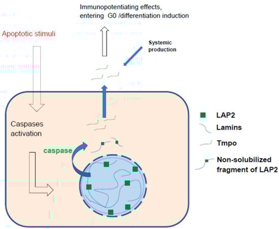 Summary: Tmpo, a fragment of LAP2, plays an important role in cell division and cell cycle regulation. As a result of apoptotic but not necrotic processes, LAP2 is cleaved and solubilised, and a Tmpo-containing fragment may theoretically be released into the extracellular space (although this is not shown directly) (Figure 6). In an extracellular environment, Tmpo regulated the activity of immune cells and caused the maturation of bone marrow cells. In general, the effect of extracellular Tmpo on the surrounding cells is rather anti-proliferative, but it is not pro-senescent, i.e., it directs the cell towards the G0 phase and differentiation and away from the senescent pathway, that is, restoring the normal state after stress exposure. This effect may be realised through the YY2 cascade, which has not been thoroughly investigated to date.