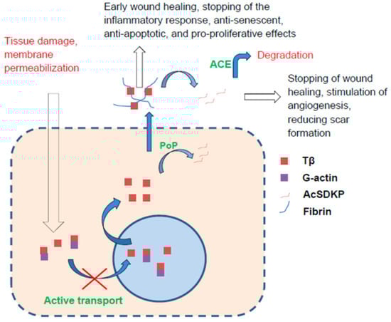 The active role of Tβ4 in wound healing has been demonstrated in many models. This peptide is present in cells in very large amounts, as it is involved in the sequestration of G-actin, a monomeric form of actin, from which actin fibres (F-actin) are generated in response to the corresponding extracellular or intracellular signals []. In particular, large amounts of Tβ4 contain platelets and polymorphonuclear leukocytes, which are the first to migrate into the wound site and secrete factors that attract various other cells []. Wound fluid contains large amounts of Tβ4 released from platelets and possibly from damaged tissue []. During the formation of a blood clot, Tβ4 crosslinks with fibrin, and consequently, a large amount of this peptide accumulates at the site of damage, stimulating the tissue-healing process. It was shown that Tβ4 simulated the migration of keratinocytes and endothelial cells but did not affect their proliferation []. Tβ4 reduced the production of key inflammatory cytokines and chemokines by inhibiting the pro-inflammatory NF-κB cascade [,]. Acetyl-N-Ser-Asp-Lsy-Pro (AcSDKP), a biologically active fragment of Tβ4, is produced from Tβ4 by the enzyme prolyl oligopeptidase, which is involved in the maturation of many peptide hormones []. This peptide stimulated the formation of capillary-like structures in vitro, increased the secretion of the active form of MMP-1, and stimulated the formation of blood vessels in vivo []. AcSDKP exerted an anti-inflammatory effect by inhibiting the differentiation of bone marrow stem cells into macrophages, activation and migration of macrophages, and release of pro-inflammatory cytokines by activated macrophages []. In plasma, AcSDKP is degraded by angiotensin-converting enzyme (ACE) []. It is assumed that the formation of AcSDKP leads to the inhibition of the active process of inflammation and tissue remodelling. In the early stages of healing, a large amount of Tβ4 is present in the wound; however, in subsequent stages, in response to a certain signal, endopeptidases are activated, and a large amount of AcSDKP is formed, which slows down the healing process []. Thus, the sequential appearance of Tβ4 and AcSDKP may reflect different stages of the wound healing process.