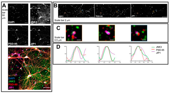 To determine JNK3–JIP1–PSD95 colocalization, we cultured primary hippocampal neurons. At DIV14, upon fixation, we stained them with specific antibodies against JNK3, JIP1, and PSD95. Cultures were first analyzed using confocal microscopy to visualize neuronal morphology and staining, confirming a mainly cytoplasmic localization for all three proteins: JNK3, JIP1, and PSD95 (Figure 1A). Next, we analyzed neuronal processes by performing 3D structured illumination microscopy (3D-SIM). We used 3D-SIM as it is a super-resolution microscopy technique that improves the resolution of optical microscopes from 250 nm to about 125 nm, and can be used to study the subcellular colocalization of proteins [39,40,41,42,43]. We took images using a 100× objective (Figure 1B) and identified regions of signal overlap corresponding to the different proteins (Figure 1C). We next analyzed such areas by performing profile analysis of single loci, and we found that JNK3–JIP1–PSD95 can colocalize in primary hippocampal neurons (Figure 1D), thus suggesting that these proteins can form complexes in neuronal processes.