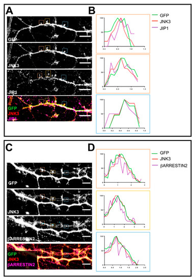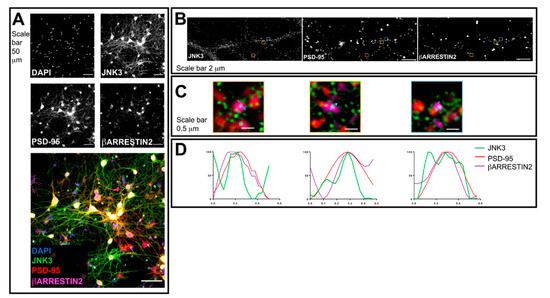 Next, we performed a similar analysis for β-arrestin2, together with JNK3 and PSD95. We stained hippocampal neuronal cultures with antibodies against JNK3, β-arrestin2, and PSD95. The confocal images acquired with a 40× objective reveal that the staining of all three proteins shows a cytoplasmic localization (Figure 2A). Next, we switched to 3D-SIM and compared the localization of JNK3, β-arrestin2, and PSD95 in neuronal processes (Figure 2B). Profile analysis shows that JNK3–β-arrestin2–PSD95 can colocalize in primary hippocampal neurons (Figure 2C,D), suggesting that these proteins, and JNK3–JIP1–PSD95, form complexes in neuronal processes.