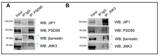 Immunoprecipitation outputs used to assess JNK3–JIP1–β-arrestin2–PSD95 colocalization in primary hippocampal neurons. (A) PSD95 was immunoprecipitated from the cell lysate homogenate using PSD95 antibody, and immune complexes were analyzed for the presence of JNK3, JIP1, and β-arrestin2. Immunoprecipitation with IgG antibody was used as a control. (B) JNK3 was immunoprecipitated from the cell lysate homogenate using JNK3-specific antibody, separated by SDS-PAGE, and analyzed via Western blot with anti-PSD95, anti-JIP1, and anti-β-arrestin2 antibodies. Immunoprecipitation with IgG antibody was used as a control. * indicates non-specific bands.