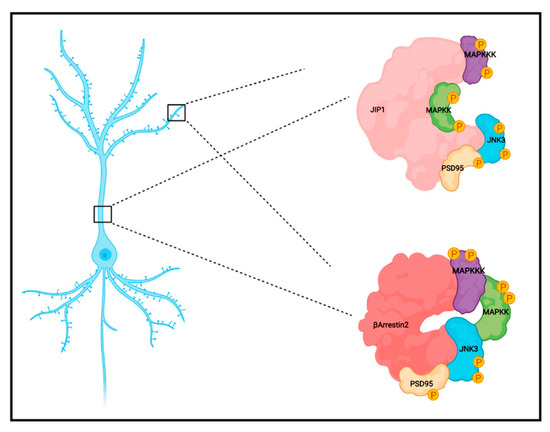 Similar to other MAPKs, JNK3 is regulated by scaffold proteins [11]. To date, the two most studied JNK scaffolds are JIP1 and β-arrestin2; however, their specific interaction with JNK3 in brain cells has been largely overlooked.