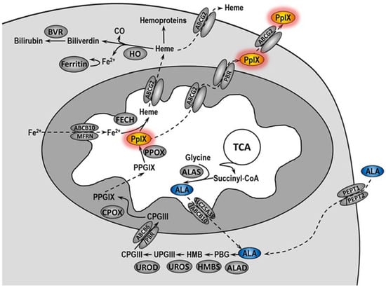 Heme metabolism pathway. ALA is normally synthetized in the mitochondrial matrix by combining glycine with succinyl-CoA in a reaction catalyzed by ALA synthase (ALAS). After passing into the cytoplasm, ALA is converted into coproporphyrinogen III (CPGIII) as a result of numerous changes. Exogenously administered 5-ALA is delivered to the cytoplasm of cells by peptide transporter 1 and 2 (PEPT1 and PEPT2). CPGIII is transported to the intermembrane space of mitochondria where it is converted by coproporphyrinogen oxidase (CPOX) to protoporphyrinogen IX (PPGIX) and then in the mitochondrial matrix to PpIX by protoporphyrinogen oxidase (PPOX). Next, ferrochelatase (FECH) leads to the formation of heme by incorporating iron into PpIX. PpIX and heme can be released from the cell via the ABCG2 transporter. Heme in the cell is used to create hemoproteins or it is degraded by heme oxygenase (HO), leading to the release of biliverdin, CO, and Fe2+. Iron ions may be bound and stored by ferritin. Biliverdin is converted to bilirubin by biliverdin reductase (BVR). ABCB10—ABC subfamily B member 10; ALAD—5-aminolevulinic acid synthase dehydratase; HMB—hydroxymethylbilane; MFRN—mitoferrin; PBG—porphobilinogen; PBGD—porphobilinogen deaminase; PBR—peripheral-type benzodiazepine receptor; SLC25A38—solute carrier family member 38; TCA—tricarboxylic acid; UPGIII—uroporphyrinogen III; UROD—uroporphyrinogen decarboxylase; UROS—uroporphyrinogen III synthase.