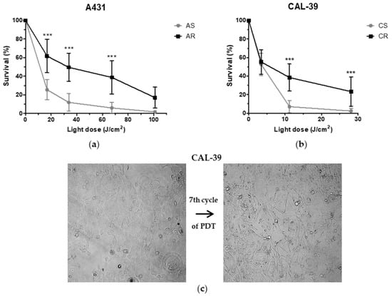 Cell survival in response to PDT. (a) Viability of A-431 parental cells that are sensitive to PDT (AS) and isolated resistant cells (AR) after PDT treatment. (b) Viability of CAL-39 parental cells, those sensitive to PDT (CS), and isolated resistant cells (CR). Cell survival was expressed as percentage of the non-treated control. Points represent average of at least three independent experiments. Asterisks indicate significant differences between the sensitive and resistant cells calculated by one-way ANOVA followed by the Bonferroni test (*** p ≤ 0.001). (c) Change in cell morphology after the 7th cycle of PDT in the CAL-39 cell line.