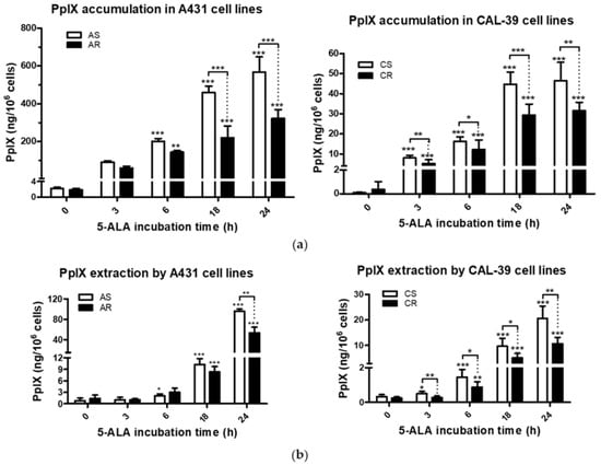 PpIX accumulation and extraction. (a) PpIX levels in A-431 and CAL-39 cell lines. (b) PpIX levels in culture media collected from above A-431 and CAL-39 cells. The amount of PpIX was calculated from standard curve and presented in ng per 106 cells. Asterisks indicate statistical significance of differences between untreated cells and cells incubated with ALA for various periods of time, or the sensitive and resistant cells calculated by Student’s t-test (* p ≤ 0.05, ** p ≤ 0.01, *** p ≤ 0.001).