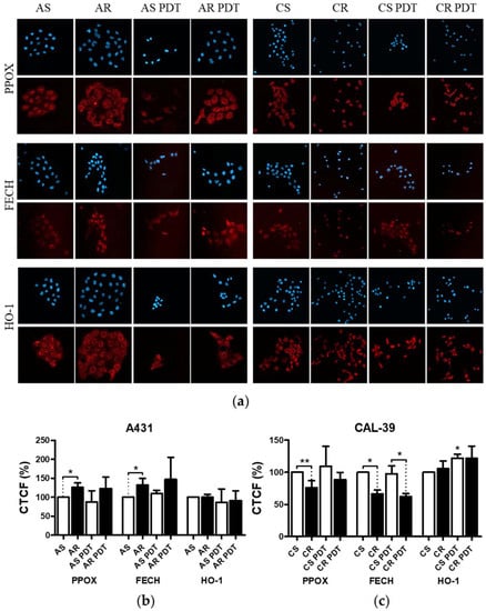 Analysis of the levels of PPOX, FECH, and HO-1. (a) Images of stained cells, before and after PDT treatment. (b) Graph with percentage values of corrected total cell fluorescence (CTCF) of untreated, parental cells. (c) Graph with percentage values of corrected total cell fluorescence (CTCF) of CAL-39 cell lines. Asterisks indicate the statistical significance of differences between cells after PDT and untreated control, and between sensitive and resistant cells calculated by Mann–Whitney test (* p ≤ 0.05, ** p ≤ 0.01).