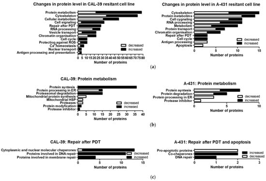 Changes in protein abundance in PDT-resistant cells as compared to the therapy-sensitive, parental cells. (a) Proteins whose level was changed in PDT-resistant cells compared to parental, sensitive cell lines, were grouped by processes in which they participate. (b) Analysis of proteins involved in protein metabolism. (c) Analysis of proteins that may participate in repair after PDT and apoptosis.