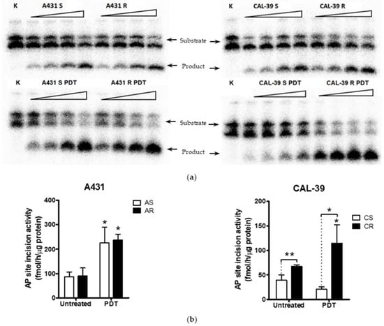 No difference in APE1 endonuclease activity was observed between sensitive and resistant A-431 cells. However, both AS and AR showed increased activity of this enzyme after PDT (Figure 6a). These results suggest that APE1 DNA repair function is important for diminishing the PDT effects.