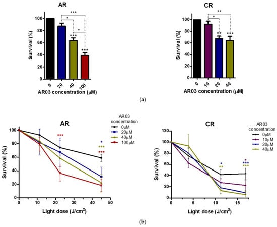 Cells were seeded in 96-well culture plates 24 h before the experiment (plated as before). Cells were incubated for 3 h with 5-ALA and AR03 (in concentrations described before) in serum-free medium. Then, cells were irradiated with increased light doses: for A-431 resistant cells—11.2–44.9 J/cm2; for CAL-39 resistant cells—3.4–16.8 J/cm2; for MCF10A cell line—2.5–7.6 J/cm2; HEK293T and K21 cell lines—0.7–2.1 J/cm2. Power density for resistant to PDT cancer cell lines was 187 W/m2, for MCF10A—84 W/m2, and for HEK293T and K21 cell lines—23 W/m2. Afterwards, the medium in all plates was replaced for 16 h with fresh culture medium supplemented with appropriate concentrations of AR03. When incubation time was over, cell viability assay was performed.